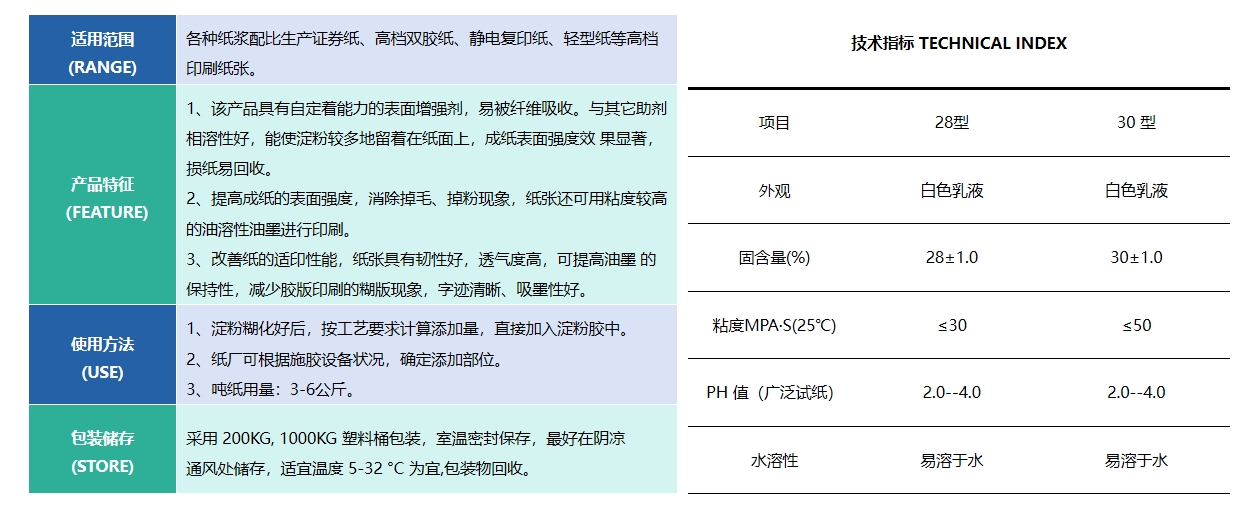 HQ-SC913 陰離子紙張表面增強(qiáng)劑 該產(chǎn)品是苯乙烯丁酯系列的高分子共聚物,其成膜性好,與纖維結(jié)合力比較強(qiáng),大大改善成紙物理表面性能,提高紙張的表面強(qiáng)度,防止掉毛、掉粉現(xiàn)象,同時(shí)能提高紙張的物理強(qiáng)度、平滑度、改善紙的印刷性能。適應(yīng)當(dāng)前高速印刷機(jī)的需求及多色套色印刷的潛在市場(chǎng)。使用過程中可以與增稠劑混合使用,是一種較理想的表面性能修飾劑。